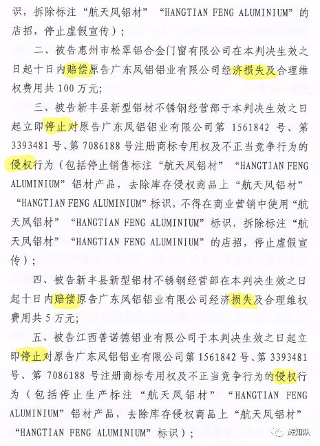 不久前,关于广东凤铝铝业有限公司与惠州市松翠铝合金门窗有限公司、新丰县新型铝材不锈钢经营部、江西普诺德铝业有限公司、江西辉煌铝业有限公司侵害商标权及不正当竞争纠纷一案,一审划上圆满句号。辉知队对侵权行为零容忍,代理原告严格追究侵权者责任,以法释法,以法普法,获法院支持,最终法院判决四被告停止侵权并赔偿损失共计250余万,判决结果如下: